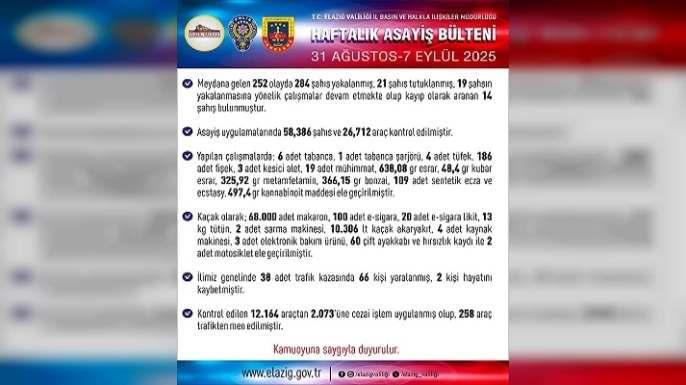 SERHED HABER - Elazığ Valiliği, 31 Ağustos- 7 Eylül 2025 tarihleri arasındaki haftalık asayiş verilerini açıkladı. Kent genelinde meydana gelen 252 olayda 248 şüpheli yakalanırken, 21 kişi tutuklandı. Çalışmalarda 58 bin 386 şahıs ve 26 bin 712 araç denetlendi. Kontrol edilen araçlardan, 2 bin 73’üne cezai işlem uygulanırken 258 araç da trafikten men edildi.