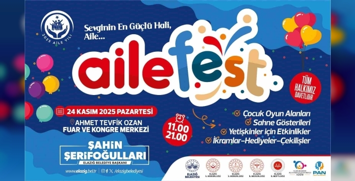 Elazığ Belediyesi tarafından yapılan açıklamada, "2025 Aile Yılı kapsamında düzenlenecek AileFest’in, şehirde birlik, dayanışma ve aile olma kültürünü güçlendirecek ve özel bir buluşma olacak. 24 Kasım Pazartesi günü, saat 11.00 - 21.00 arasında Ahmet Tevfik Ozan Fuar ve Kongre Merkezi’nde düzenleyeceğimiz AileFest etkinliğinde aile değerlerini güçlendirmeyi ve birlikte olmanın mutluluğunu paylaşmayı hedefliyoruz. Çocuklarımız için eğlenceli oyun alanları, sahne gösterileri, ikramlar, hediyeler, çekilişler ile çocuklardan yetişkinlere kadar her yaştan katılımcıya hitap eden dopdolu bir içeriğe sahip etkinliğe tüm hemşerilerimiz davetlidir" ifadelerine yer verildi.