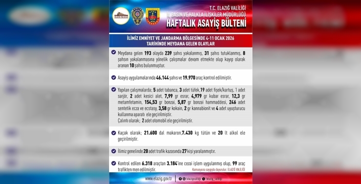 SERHED HABER - Elazığ Valiliği, 04-11 Ocak 2026 tarihlerini kapsayan haftalık asayiş bültenini yayımladı. Bültende yer alan bilgilere göre, kent genelinde meydana gelen 193 olayda 239 şahıs yakalandı, 31 kişi de tutuklandı.