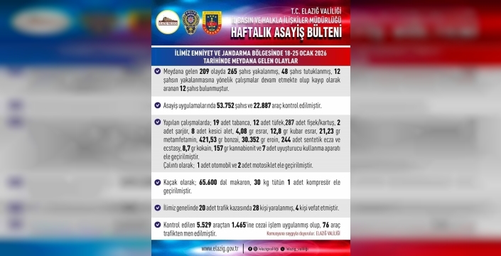 Elazığ Valiliği, 18-25 Ocak 2026 tarihlerini kapsayan haftalık asayiş bültenini yayımladı. Bültende yer alan bilgilere göre, kent genelinde meydana gelen 209 olayda 265 şahıs yakalandı, 48 kişi de tutuklandı. Çalışmalarda 53 bin 752 şahıs ve 22 bin 887 araç denetlendi. Kontrol edilen araçlardan, bin 465’inde cezai işlem uygulanırken 76 araç da trafikten men edildi. Kent genelinde meydana gelen 20 adet trafik kazasında 28 kişi yaralanırken 4 kişi de hayatını kaybetti.