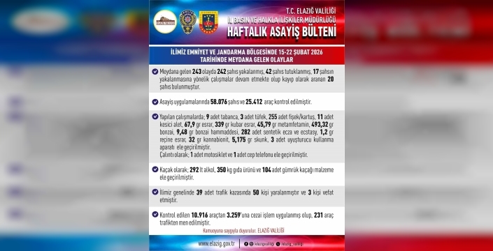 Elazığ Valiliği, 15-22 Şubat 2026 tarihlerini kapsayan haftalık asayiş bültenini yayımladı. Bültende yer alan bilgilere göre, kent genelinde meydana gelen 243 olayda 242 şahıs yakalandı, 42 kişi de tutuklandı. Çalışmalarda 58 bin 76 şahıs ve 25 bin 412 araç denetlendi. Kontrol edilen araçlardan, 3 bin 259’una cezai işlem uygulanırken 231 araç da trafikten men edildi. Kent genelinde meydana gelen 39 adet trafik kazasında 51 kişi yaralanırken 3 kişi de hayatını kaybetti.