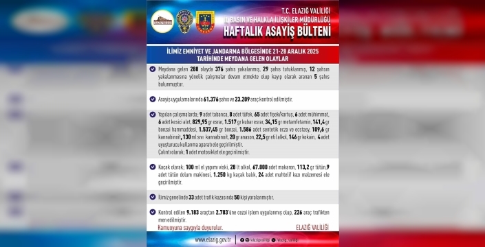 Elazığ Valiliği, 21-28 Aralık 2025 tarihlerini kapsayan haftalık asayiş bültenini yayımladı. Bültende yer alan bilgilere göre, kent genelinde meydana gelen 288 olayda 376 şahıs yakalandı. 29 kişi de tutuklandı. Çalışmalarda 61 bin 376 şahıs ve 23 bin 209 araç denetlendi. Kontrol edilen araçlardan, 2 bin 783’üne cezai işlem uygulanırken 226 araç da trafikten men edildi. Kent genelinde meydana gelen 33 adet trafik kazasında 50 kişinin yaralandı.