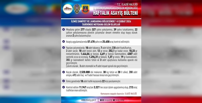 SERHED HABER - Elazığ İl Emniyet Müdürlüğü ve İl Jandarma Komutanlığı ekipleri tarafından 1-8 Şubat 2026 tarihleri arasında gerçekleştirilen asayiş uygulamalarında ulaşılan rakamlar kamuoyuyla paylaşıldı.