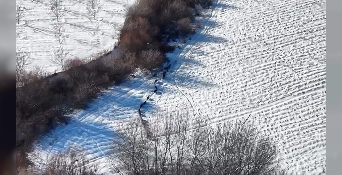 Karların üstünde domuzları gören bir vatandaş, dronla domuzları takip etti. Doğada koşan sürü, bir süre sonra gözden kayboldu.