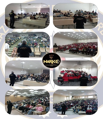 SERHED HABER - Elazığ Emniyet Müdürlüğü Narkotik Suçlarla Mücadele Şube Müdürlüğü tarafından uyuşturucuyla mücadele çerçevesinde 7-31 Ekim tarihleri arasında Narko-Gençlik ve Narko-Rehber faaliyetleri kapsamında, madde bağımlığı, bağımlılık yapıcı maddeler, bağımlı kişinin özellikleri, sokak satıcılarının profilleri, narkotik maddelerin sokak adları, narkotik maddelerin ticaret ve tüketiminde kullanılan dil, şüpheli mekanlar, uyuşturucu ile mücadelede uygulanan yasal müeyyideler, uyuşturucu ile mücadelede hayata geçirilen ihbar mekanizmaları ve çözüm merkezleri konusunda, Fırat Üniversitesinde personel, akademisyen, özel güvenlik ve öğrencilerin katılımı ile 54 eğitimde 6 bin 619 kişiye bilinçlendirme ve bilgilendirme faaliyeti gerçekleştirildi.