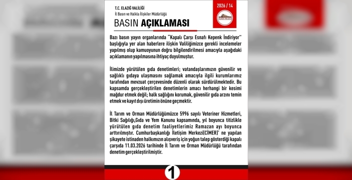 Elazığ Valiliği’nden yapılan açıklamada, "İlimizde yürütülen gıda denetimleri; vatandaşlarımızın güvenilir ve sağlıklı gıdaya ulaşmasını sağlamak amacıyla ilgili kurumlarımız tarafından mevzuat çerçevesinde düzenli olarak sürdürülmektedir. Bu kapsamda gerçekleştirilen denetimlerin amacı herhangi bir kesimi mağdur etmek değil; halk sağlığını korumak, güvenilir gıda arzını temin etmek ve kayıt dışı üretimin önüne geçmektir. İl Tarım ve Orman Müdürlüğümüzce 5996 sayılı Veteriner Hizmetleri, Bitki Sağılığı, Gıda ve Yem Kanunu kapsamında, yıl boyunca titizlikle yürütülen gıda denetim faaliyetlerimiz Ramazan ayı boyunca arttırılmıştır. Cumhurbaşkanlığı İletişim Merkezi(CİMER)’ ne yapılan şikayete istinaden halkımızın alışveriş için yoğun talep gösterdiği kapalı çarşıda 11.03.2026 tarihinde İl Tarım ve Orman Müdürlüğü tarafından denetim gerçekleştirilmiştir. Vatandaşlarımızın güvenilir gıda tüketmesi adına kapalı çarşı esnafına etiketsiz ürün satmaması, gıdaların muhafaza koşullarına ve hijyene dikkat edilmesi hususunda uyarılarda bulunulmuştur. Bu denetimde hiçbir işletmeye yasal işlem yapılmamış olup işletmelere mevzuat kapsamında bilgilendirici eğitim ve rehberlik uygulaması gerçekleştirilmiştir. İl Tarım ve Orman Müdürlüğümüzün amacı köylü ürünü adı altında satılan ama köylü ürünü olmayan, merdiven altı olarak üretilen özellikle büyük çoğunluğu il dışından gelen ve hijyenik olmayan şartlarda üretilen süt ürünlerinin satışının önüne geçmektir. Köylülerimizin kendi getirdikleri ve pazarda, marketlerde ya da kapalı çarşıda satılan ürünlere hiç bir işlem yapılmamaktadır" denildi.