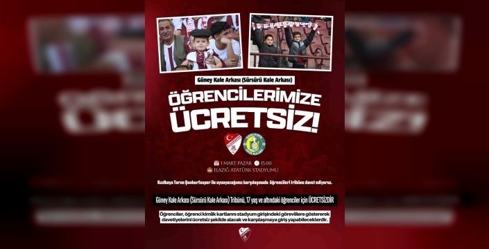 SERHED HABER - TFF 2. Lig Beyaz Grup’un 28. Haftası’nda Şanlıurfaspor’u konuk edecek olan Elazığspor’da yönetim kurulu kararıyla kale arkası tribün biletleri 17 yaş altı öğrencilere ücretsiz yapıldı. Elazığspor Kulübü’nden yapılan açıklamada; "Haydi gençler, yeriniz hazır. Güney Kale Arkası (Sürsürü Kale Arkası) Tribünü, 17 yaş ve altındaki öğrenciler için ücretsizdir. Öğrenciler, öğrenci kimlik kartlarını stadyum girişindeki görevlilere göstererek davetiyelerini ücretsiz alıp maça giriş yapabileceklerdir" denildi.