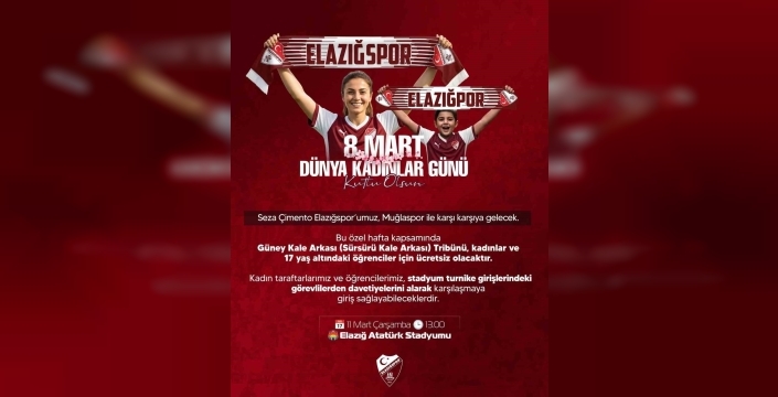 Nesine 2. Lig Beyaz Grup’un 30. Haftası’nda çarşamba günü Muğlaspor ile kritik bir maça çıkacak olan Seza Çimento Elazığspor’da Şanlıurfaspor maçında başlatılan ücretsiz maç bileti uygulaması bu maçta da uygulanacak. 17 yaş altı taraftarlara ücretsiz olan maç biletlerinin kapsamına kadın taraftarlar da eklendi. 8 Mart Dünya Kadınlar Günü münasebetiyle kadın taraftarlarına jest yapan bordo-beyazlı kulüp, maç biletlerini ücretsiz yaptı.