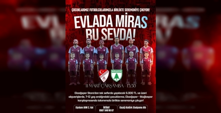 Elazığspor Kulübü’nden "Bir sevda nesilden nesile" başlığıyla yapılan paylaşımda; "11 Mart Çarşamba günü oynayacağımız Muğlaspor karşılaşmasında çocuklarımız, futbolcularımızla birlikte seremoniye çıkıyor. Elazığspor Store’dan tek seferde yapılacak 5.000 TL ve üzeri alışverişlerde, 7-12 yaş aralığındaki evlatlarımız bu özel anı sahada yaşayacak. Bir çocuğun elinden tutup o çimlere adım atmak işte miras dediğimiz tam olarak bu" ifadeleri kullanıldı.
