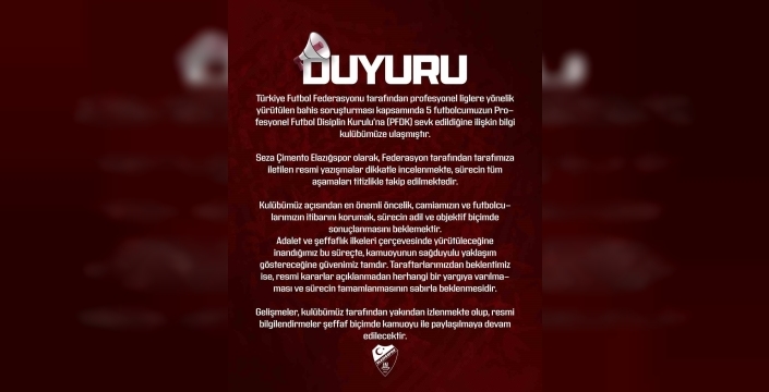 Elazığspor Kulübü’nden yapılan açıklamada, "Türkiye Futbol Federasyonu tarafından profesyonel liglere yönelik yürütülen bahis soruşturması kapsamında 5 futbolcumuzun Profesyonel Futbol Disiplin Kurulu’na (PFDK) sevk edildiğine ilişkin bilgi kulübümüze ulaşmıştır. Seza Çimento Elazığspor olarak, Federasyon tarafından tarafımıza iletilen resmi yazışmalar dikkatle incelenmekte, sürecin tüm aşamaları titizlikle takip edilmektedir. Kulübümüz açısından en önemli öncelik, camiamızın ve futbolcularımızın itibarını korumak, sürecin adil ve objektif biçimde sonuçlanmasını beklemektir. Adalet ve şeffaflık ilkeleri çerçevesinde yürütüleceğine inandığımız bu süreçte, kamuoyunun sağduyulu yaklaşım göstereceğine güvenimiz tamdır. Taraftarlarımızdan beklentimiz ise, resmi kararlar açıklanmadan herhangi bir yargıya varılmaması ve sürecin tamamlanmasının sabırla beklenmesidir. Gelişmeler, kulübümüz tarafından yakından izlenmekte olup, resmi bilgilendirmeler şeffaf biçimde kamuoyu ile paylaşılmaya devam edilecektir" denildi.