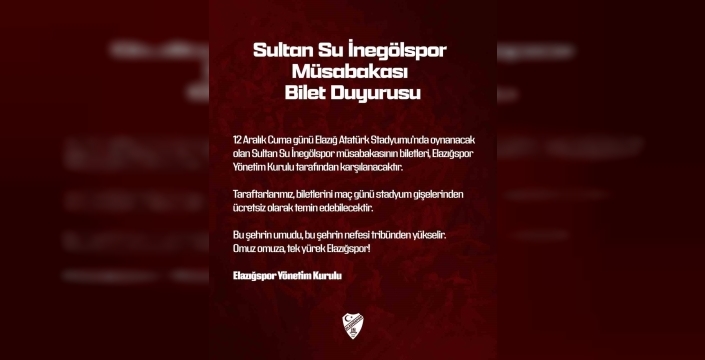 Kulüpten yapılan açıklamada, "12 Aralık Cuma günü Elazığ Atatürk Stadyumu’nda oynanacak olan Sultan Su İnegölspor müsabakasının biletleri, Elazığspor Yönetim Kurulu tarafından karşılanacaktır. Taraftarlarımız, biletlerini maç günü stadyum gişelerinden ücretsiz olarak temin edebilecektir. Bu şehrin umudu, bu şehrin nefesi tribünden yükselir. Omuz omuza, tek yürek Elazığspor" denildi.