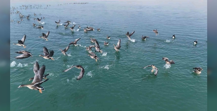 Göç yolculuklarını sürdüren küçük sakarca kazları, Van’ın doğusunda yer alan 114 kilometrekare yüzey alanı ve bin 808 rakımı ile Erçek Gölü’nde mola verdi. Gölge ve çevresinde konaklayan yüzlerce küçük sakarca kazı dron ile net bir şekilde kayıt altına alındı. Zarif görüntüleri ile Erçek Gölü’ne renk katan küçük sakarca kazları görsel şölen oluşturdu.