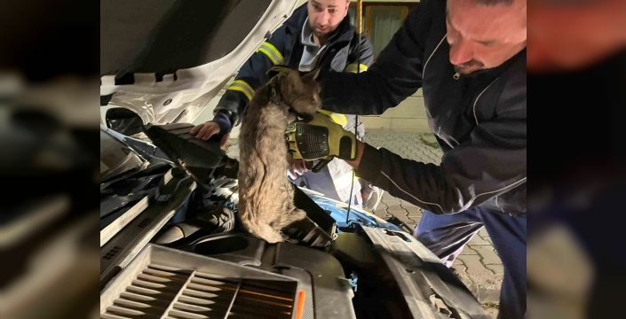 SERHED HABER - Aracını park ettiği yerden almaya giden sürücü, ön kaputtan seslerin geldiğini duydu. Kaput kapağını kaldıran sürücü, motor kısmına kedinin sıkıştığını anlayınca durumu itfaiyeye bildirdi.