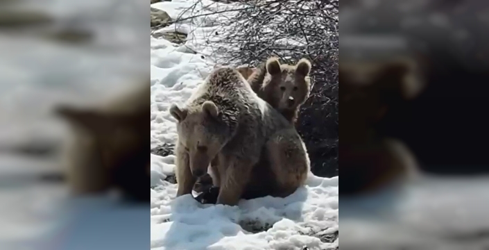 Erzincan’da kış uykusundan erken uyanan ayılar, karla kaplı arazide oynarken görüntülendi.