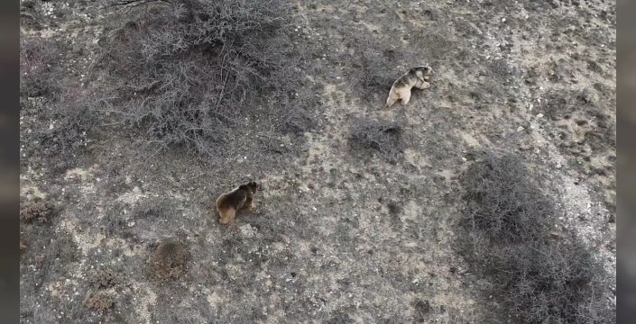 Erzincan’ın Refahiye ilçesinde kış uykusundan uyanan ayılar, yeşeren arazide ot yiyip beslenirken havadan görüntülendi.