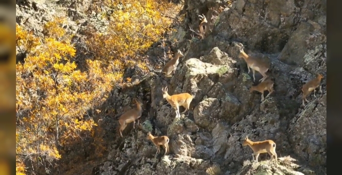 Sarp kayalıklar üzerinde rahatça dolaşan keçiler, doğayla bütünleşen görüntüleriyle izleyenleri büyüledi. Sonbaharın sarı ve kahverengi tonları ile bezenen orman örtüsü, yaban keçilerinin zarif hareketleriyle birleşince ortaya kartpostallık kareler çıktı.