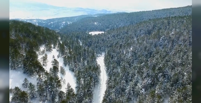Türkiye’nin birçok noktasından her mevsim yerli ve yabancı turistleri ağırlayan tabiat parkında, kar yağışı sonrası çam ormanları beyaz örtüyle kaplandı. Doğayla iç içe eşsiz manzaralar oluşurken, parkın kış güzelliği havadan drone ile görüntülendi.