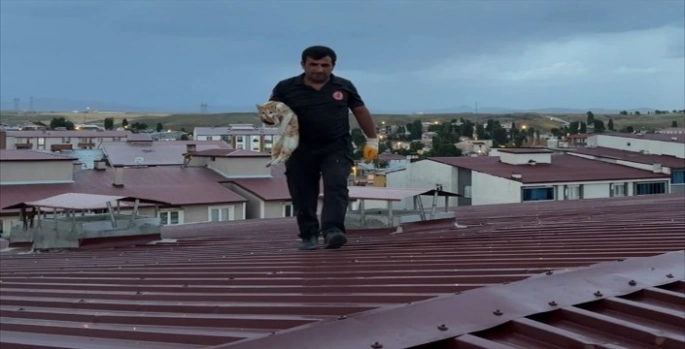 Bölgeye gelen Erzurum Büyükşehir Belediyesi Horasan İtfaiye Amirliği ekipleri, çatıya çıkarak mahsur kalan kediyi kurtardı.