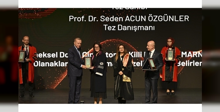 İstanbul Teknik Üniversitesi (İTÜ) Lisansüstü Eğitim Enstitüsü Yapı Bilimleri Doktora Programı kapsamında tamamladığı "Geleneksel Doğal Çimentonun Killi Kireçtaşı (Marn) ile Üretim Olanakları ve Performans Özelliklerinin Belirlenmesi" başlıklı tez çalışmasıyla ödül almaya hak kazanan Dr. Öğr. Üyesi Nazife Özer, ödülünü Cumhurbaşkanı Erdoğan’ın elinden aldı.
