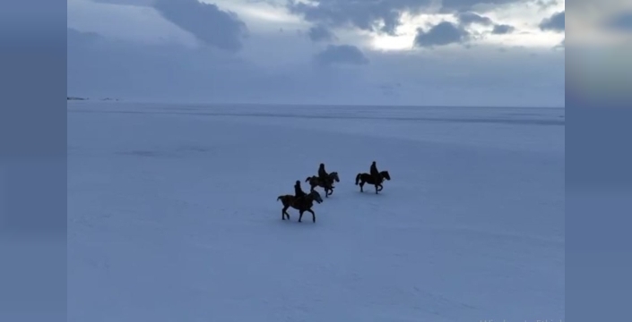Çıldır Gölü’nde kışın büyüleyici atmosferi bir kez daha dikkat çekti. Yüzeyi tamamen donan gölün üzerinde atlarına binen gençler, dörtnala koşarak adeta doğayla iç içe nefes kesen anlara imza attı.