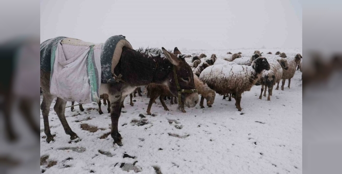 Yem fiyatlarının artmasından dolayı hayvanlarını henüz kışlık bölgelere indiremeyen üreticiler, kar altında hayvanlarını otlatmaya devam ediyor. Kar yağışı, üreticilerin günlük yaşamını da olumsuz etkilerken, çadırlarda zorlu yaşam koşulları göze çarpıyor.