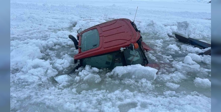 SERHED HABER- Ardahan’ın Çıldır ilçesindeki yüzeyi buz tutan Çıldır Gölü üzerinde kar temizleme çalışması yapan traktör, buzun kırılması sonucu suya gömüldü, sürücü son anda kurtarıldı.