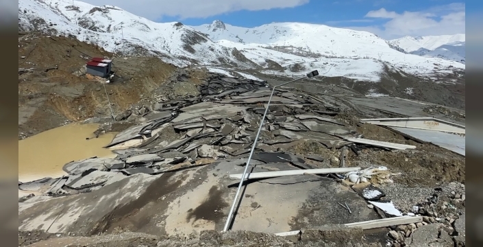 Hakkari-Yüksekova kara yolu üzerinde meydana gelen heyelan entegre katı atık tesisinde büyük hasara yol açarken, kara yolunda ortaya çıkan görüntüler ise 7 büyüklüğündeki depremi andırıyor.