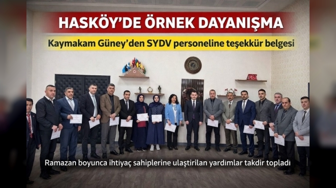 SERHED HABER- Muş’un Hasköy ilçesinde, Ramazan ayı süresince ihtiyaç sahibi vatandaşlara yönelik yürütülen sosyal yardım faaliyetlerinde görev alan personelin özverili çalışmaları takdir topladı. Hasköy Kaymakamı İsmail Güney, bu süreçte büyük gayret gösteren Korkut Sosyal Yardımlaşma ve Dayanışma Vakfı (SYDV) Müdürlüğü personeline teşekkür belgesi takdim etti.