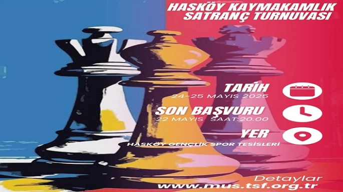 SERHED HABER- Muş’un Hasköy ilçesi, 24-25 Mayıs günlerinde satranç organizasyonuna ev sahipliği yapacak. Hasköy İlçe Gençlik ve Spor İlçe Müdürlüğü ile Türkiye Satranç Federasyonu (TSF) Muş İl Temsilciliği iş birliğiyle düzenlenecek olan Hasköy Kaymakamlık Satranç Turnuvası, ilçede spor kültürünü güçlendirmeyi hedefliyor. Turnuva, Gençlik Spor Tesisleri'nde bireysel İsviçre sistemi ile organize edilecek ve 35 dakika + 30 saniye eklemeli zaman temposu uygulanacak.