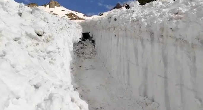 Hakkari'nin Yüksekova ilçesindeki İkiyaka Dağları bölgesinde haziran ayına rağmen kalınlığı 6 metreyi bulan karda yürütülen yol açma çalışmaları devam ediyor.