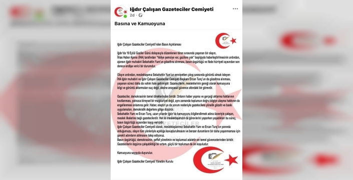 Iğdır Çalışan Gazeteciler Cemiyetinden yapılan açıklamada, "Iğdır’da 19 Eylül Gaziler Günü dolayısıyla düzenlenen tören sırasında yaşanan bir olayın, İhlas Haber Ajansı (İHA) tarafından "Valiye şemsiye var, gazilere yok" başlığıyla haberleştirilmesinin ardından, ajansın Iğdır muhabiri Sebahattin Yum’un gözaltına alınması, basın özgürlüğü ve ifade hürriyeti açısından son derece endişe verici bir durumdur. Olayın ardından, meslektaşımız Sebahattin Yum’un emniyetten çıkışı sırasında görüntü almak isteyen İHA Iğdır muhabiri ve Iğdır Çalışan Gazeteciler Cemiyeti Başkanı Ercan Tunç’un da gözaltına alınması, yaşanan süreci daha da vahim hale getirmiştir. Gazetecilerin, mesleklerinin gereği olarak kamuoyuna bilgi ve görüntü aktarmaları suç değil, aksine anayasal güvence altındaki bir görevdir. Gazeteciler, demokrasinin temel direklerinden biridir. Onların haber yapma ve gerçeği aktarma haklarının kısıtlanması, yalnızca bireysel bir mağduriyet değil, aynı zamanda toplumun doğru bilgiye ulaşma hakkının da engellenmesi anlamına gelir. Haber, eleştiri ya da yorum nedeniyle gazetecilere yönelik gözaltı ve baskı uygulamaları, demokratik değerlere gölge düşürür. Sebahattin Yum ve Ercan Tunç, uzun yıllardır Iğdır’da kamuoyunu bilgilendirmek adına özveriyle çalışan, meslek ilkelerine bağlı gazetecilerdir. Her iki meslektaşımızın da görevlerini yaparken yaşadıkları bu süreç, basın özgürlüğü açısından kaygı vericidir. Iğdır Çalışan Gazeteciler Cemiyeti olarak, meslektaşlarımız Sebahattin Yum ve Ercan Tunç’un yanında olduğumuzu, olayın tüm yönleriyle açıklığa kavuşturulmasını ve benzer durumların bir daha yaşanmaması için gerekli adımların atılmasını talep ediyoruz. Basın özgürlüğü; demokrasinin, şeffaf yönetimin ve toplumsal adaletin en temel güvencelerinden biridir. Gazetecilerin özgürce çalışabildiği bir ortam, güçlü bir toplumun da ön koşuludur. Kamuoyuna saygıyla duyurulur." denildi.