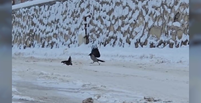 Darende’de yoğun kar yağışıyla birlikte doğada besin bulmakta güçlük çeken kargalar, ilçe merkezinde yollara ve sokak aralarına yöneldi. Karlı zeminde yiyecek arayan kargalar, buldukları her türlü besini tüketmeye çalışırken o anlar kameraya yansıdı.