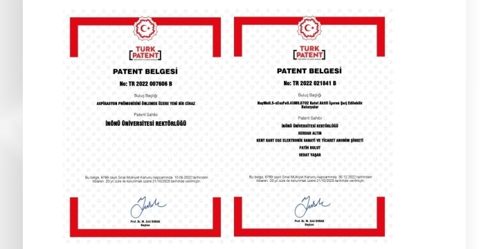İnönü Üniversitesi’nin nitelikli projeleri patentlerle tescillenmeye devam ediyor. Bu kapsamda "Aspirasyon Pnömonisini Önlemek Üzere Yeni Bir Cihaz" ile "NayMn0.5-xCoxFe0.43M0.07O2 Bataryalar Katot Aktifi İçeren Şarj Edilebilir Bataryalar" adlı buluşlar, Türk Patent ve Marka Kurumu’ndan patent almaya hak kazandı.