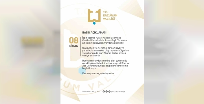 Erzurum Valiliği’nden alınan bilgilere göre olay, İspir ilçesi Yukarı Mahalle Esentepe Caddesi mevkiinde bulunan seyir terasının alt kısmında meydana geldi. Heyelan sonrası bölgeye ekipler sevk edildi. Yaşanan doğa olayında herhangi bir can kaybı veya yaralanmanın bulunmadığı belirtilen açıklamada, heyelan bölgesine yakın konumda bulunan 2 konutun güvenlik gerekçesiyle tahliye edildiği kaydedildi.