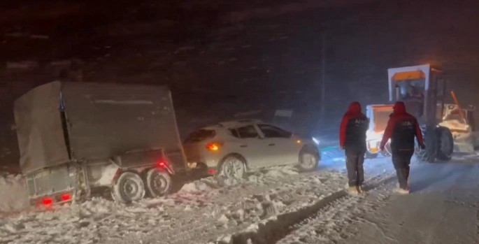 Yoğun kar yağışı ve tipi nedeniyle aracıyla karayolunda mahsur kalan vatandaşa kısa süre içinde ulaşan ekipler, aracı saplandığı yerden çıkardı.