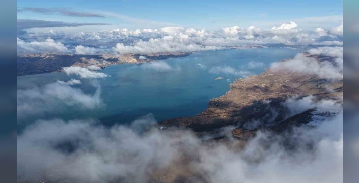 Dağ ve etekleri beyaza bürünürken, Hazar Gölü ise mavi tonuyla dikkat çekti. Bulutların ve sisin de hakim olduğu bölgede adeta kartpostallık görüntüler oluştu.