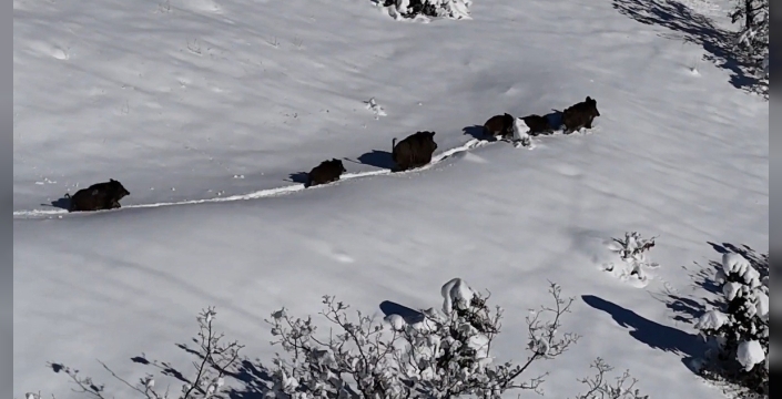 Drone kamerasına yansıyan görüntülerde, yaban domuzlarının kalın kar örtüsü üzerinde koşarak ilerlediği, zaman zaman duraksadığı ve yön değiştirerek birlikte hareket ettiği görüldü. Karla kaplı arazide uyum içinde hareket eden sürü, bir süre sonra dağlık alana doğru yönelerek gözden kayboldu.