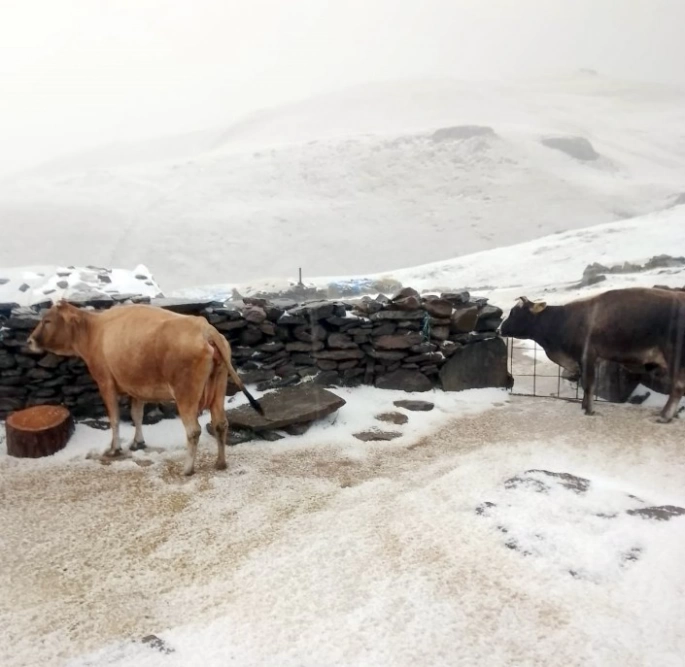 Tuygun köyünün 3 bin rakımlı yaylasında ise hayvanlarını otlatan vatandaşlar yağışa hazırlıksız yakalandı. Bölgede sağanak ardından etkili olan dolu ve kar etrafı beyaza bürüdü.