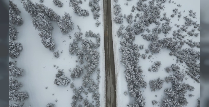 Etrafı sarıçam ormanlarıyla çevrili olan kara yolu, beyaz kar örtüsüyle birleşince doğa tutkunlarını etkileyen bir tablo ortaya çıkardı. Dron ile görüntülenen kara yolu, doğanın sadeliği ve ihtişamını aynı karede buluşturdu. Sarıçam ağaçlarının koyu yeşil tonları ile karın bembeyaz dokusu arasındaki kontrast, görsel bir şölen sundu. Bahar ayına rağmen bölgede etkisini sürdüren kar yağışı, Sarıkamış’ın kendine has iklimini bir kez daha gözler önüne serdi.