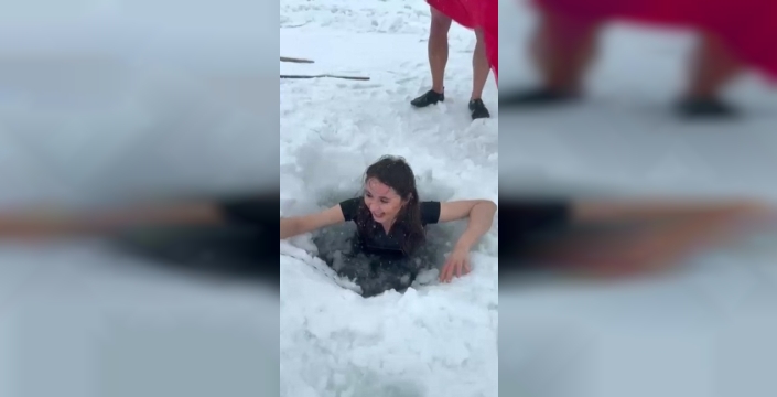 SERHED HABER- Hava sıcaklığının sıfırın altında 23 dereceyi gördüğü bölgede, bir kadın ziyaretçi buzları kırdırarak dondurucu suya girdi.