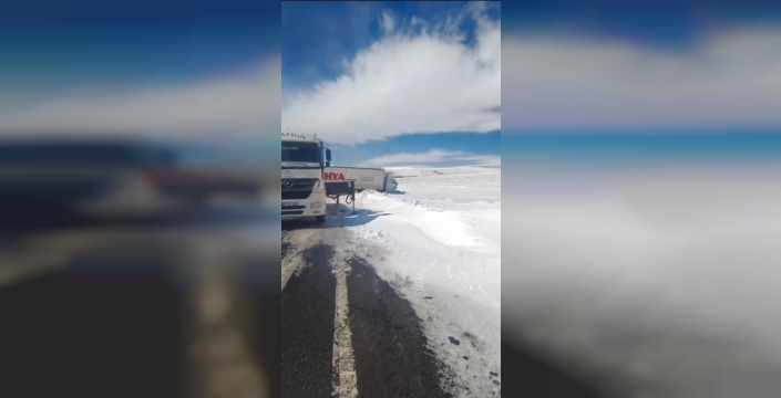 Kars’ta sürücüsünün direksiyon hakimiyetini kaybettiği tır, kayarak yolu kapattı.
