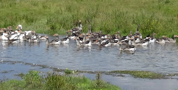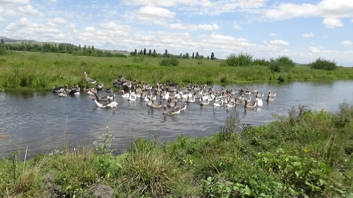 Kars'ın Arpaçay ilçesine bağlı Okçuoğlu köyünde vatandaşlar tarafından yetiştirilen kazlar, sabahın erken saatlerinde sulak meralara getiriliyor. Gün batımına kadar hem otlatılıyor, hem de derelerde yüzdürülüyor.