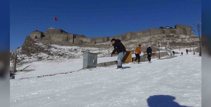 Kars’ta kar yağışının ardından etkili olan soğuk hava, çocukların ve gençlerin eğlencesine engel olamadı. Tarihi Kars Kalesi eteklerine gelen her yaştan vatandaş, yanlarında getirdikleri kızak, naylon ve ağaç parçalarıyla dik yokuştan aşağı kayarak karın tadını doyasıya çıkardı.