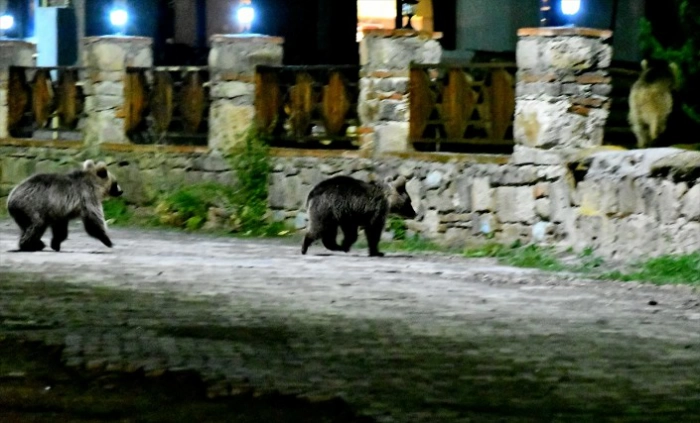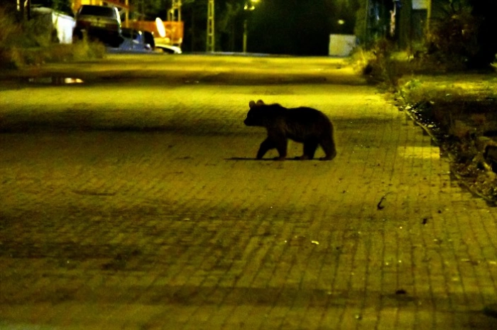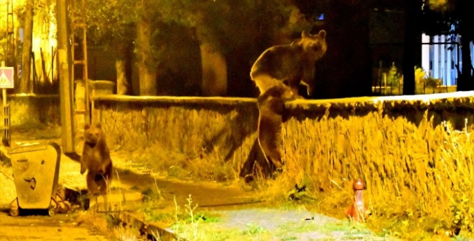 Daha sonra gece saatlerinde cadde ve sokaklarda gezinen bozayılar, çöp konteynerlerini devirerek içindeki çöplerle beslenmeye çalıştı.
