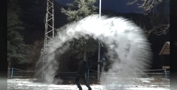 Öte yandan, kentte bir vatandaşın havaya serptiği sıcak su soğuğun etkisiyle dondu. O anlar ise kameraya yansıdı.