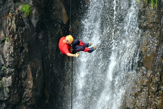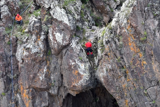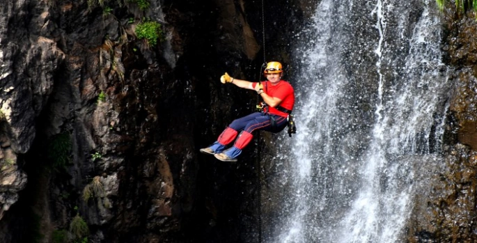 Beş kişilik grup, güvenlik önlemlerini aldıktan sonra özel ekipmanlarla yaklaşık 70 metrelik şelaleden aşağı indi, daha sonra yan taraftaki kayalıktan tırmanış yaptı.