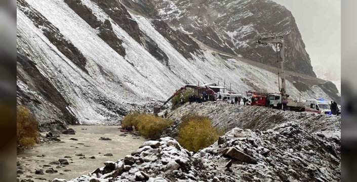 SERHED HABER- Hakkari-Van kara yolu Sere Solan mevkiinde kar yağışının ardından dağdan kopan kayalardan kaçmaya çalışan madencilerin bulunduğu araç, yaklaşık 50 metrelik uçurumdan yuvarlanarak Zap Suyu’na düştü.