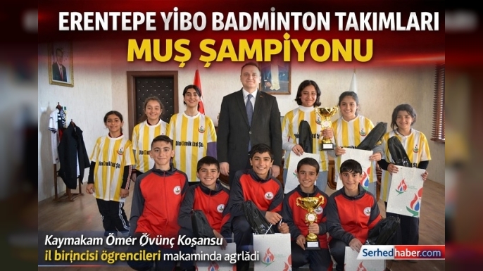 SERHED HABER - Okul Sporları kapsamında düzenlenen badminton müsabakalarında Erentepe Yatılı Bölge Ortaokulu öğrencileri büyük bir başarıya imza attı. Yıldız Erkekler ve Küçük Kızlar kategorilerinde il birincisi olan takımlar, Bulanık Kaymakamı Ömer Övünç Koşansu tarafından makamında kabul edilerek tebrik edildi.