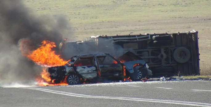 SERHED HABER - Kaza; Kars-Ani Ören karayolunda meydana geldi. Sürücülerinin isimlerinin öğrenilemediği kazada Ani istikametinden Kars'a seyir halindeki 54 HC 638 otomobil ile Kars'tan Ani istikametine seyir halindeki 36 EP 233 plakalı kamyonet çarpıştı. Çarpışmanın şiddetiyle kamyon yan yatarken, LPG'li otomobil ise alev topuna döndü.