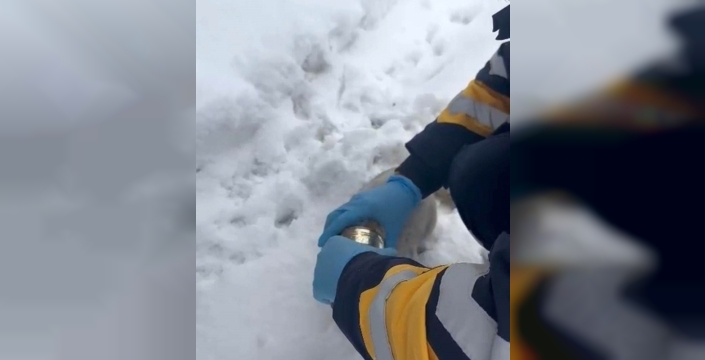 Duruma kayıtsız kalmayan personel durarak kediye yardım etti. Eldivenlerini takan Ambulans ve Acil Bakım Teknikeri Çetin Kılıç, kedinin başına sıkışan konserveyi çıkardı.